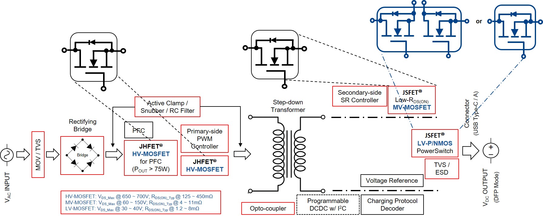 輸出功率從 18W 到 100W (甚至 120W 或更大) 、支持快充協(xié)議 (USB PD3.0/3.1, USB BC1.2, UFCS T/TAF 083-2022, Qualcomm QCxx, MediaTek PExxx、Huawei S/FCP, Oppo D/FCP, Samsung AFC, Apple 2.4A, …)、配置一個或多個 USB Type-A 及 Type-C 輸出接口的快充充電器日益普遍。它們可以一物多用,同時為智能手機、平板、智能手表及筆記本電腦等萬物互聯(lián)數(shù)字化終端里面的鋰電池快速充電。采用第三代半導(dǎo)體功率器件(氮化鎵 D/E-mode HEMT)的設(shè)計,體積小巧以及使用時溫度不會燙手,由于因近年多家世界排名前列的智能手機 OEM 不把充電器隨著新款手機一起標配而形成曲棍球棒效應(yīng),使得這類小巧的快充充電器成為市場主流。 市場上的快充充電器,常用的交直流電源轉(zhuǎn)換拓撲是 Flyback 及 LLC。Flyback 拓撲常見于功率比較小的設(shè)計,LLC 拓撲則常見于功率較大及對交直流電源轉(zhuǎn)換效率要求較高的設(shè)計。因為 BOM 相對 LLC 拓撲比較簡單,ACF-Flyback 拓撲也開始被中/小功率的設(shè)計采用,特別是初級使用高壓氮化鎵 HEMT 的設(shè)計。無論是那種拓撲,快充充電器的內(nèi)部結(jié)構(gòu)示意圖大概如上: 針對快充充電器的成用,捷捷微電 能提供完整的分立器件解決方案。比如,AC 輸入端防浪涌的 MOV、TVS、鉗制變壓器漏感而對原邊的高壓 MOSFETs VDS_Max 產(chǎn)生過壓的快恢復(fù)整流管、原邊 PFC (75W 以上的設(shè)計) 和匹配 PWM 的高壓 MOSFET、副邊同步整流中/低壓 MOSFETs、USB Type-A 及Type-C 端口的低壓 MOSFETs 及 ESD 保護等。