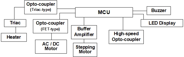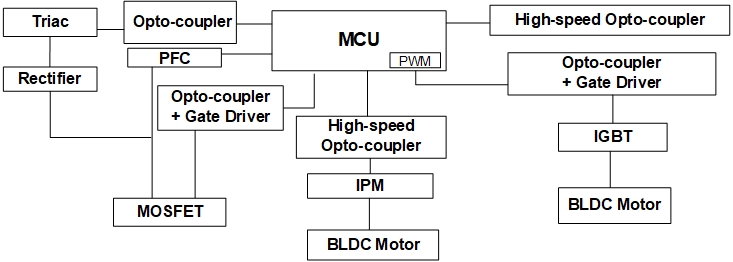 在全球氣候變暖的當(dāng)下,空調(diào)在白色家電中占有舉足輕重的地位。典型的空調(diào)系統(tǒng)由室外機(jī)、室內(nèi)機(jī)和電源單元組成。對于電源單元,捷捷微電 具有高隔離電壓光電耦合器,用于隔離 PWM 和 PFC。對于室內(nèi)機(jī),MCU 控制與光電耦合器結(jié)合的風(fēng)扇模塊、與光電三端雙向可控硅開關(guān)和外圍設(shè)備結(jié)合的加熱器開關(guān)。主隔離 MCU 和相關(guān)外圍設(shè)備,確保電路的可靠性。對于室外機(jī),使用 MCU 控制風(fēng)扇和壓縮機(jī)的電機(jī)系統(tǒng)。電機(jī)控制系統(tǒng)是各種家用電器的組成部分。每一個單獨(dú)模塊都取決于安全和環(huán)境保護(hù)要求、性能要求,當(dāng)然還有制造成本。因此,在設(shè)計家用電器時,需要加強(qiáng)對單片機(jī)和外圍設(shè)備對應(yīng)用電路的隔離,以確保電路的低噪聲。